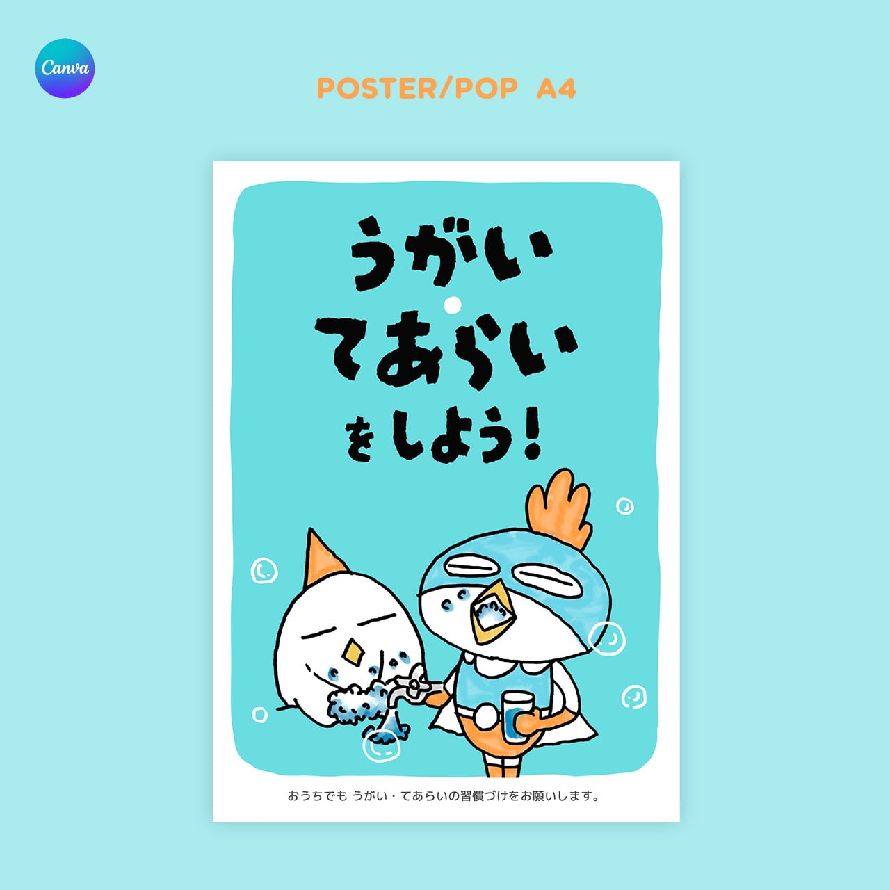 元気いっぱいのニワトリ戦士・ニワトリンのイラストが、子どもたちの手洗い・うがいを楽しくサポートする衛生指導ポスターです。保育園/小児科/キッズ教室のお手洗いなどに。
