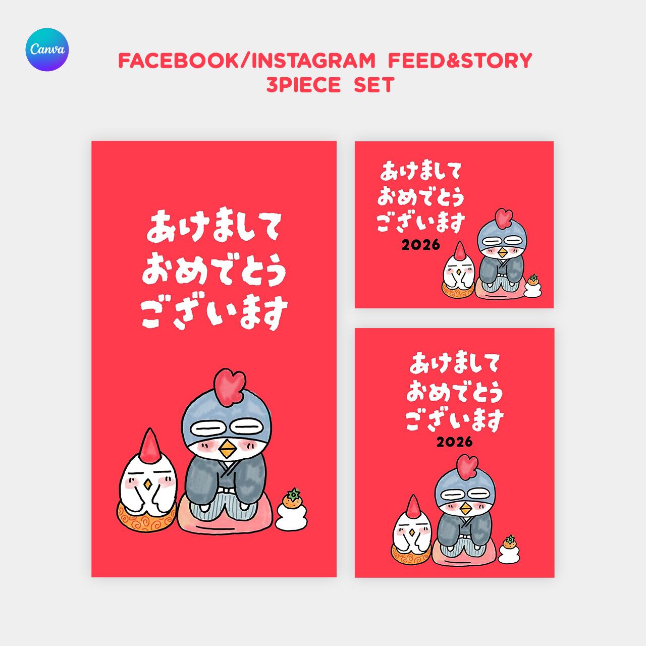 元気いっぱいのにわとり戦士「ニワトリン」の、新年のご挨拶SNS用画像3点です。